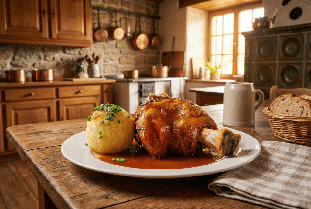 This is Bavaria’s most iconic main course, and watching one arrive at your table is theater in itself. A pork knuckle slow-roasted for 2 to 3 hours until the skin turns crackling-crisp and the meat becomes tender enough to pull apart with a fork. Traditionally marinated in beer and spices, it emerges from the oven golden, glistening, and impressive.